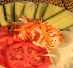 Spread with Hoisin sauce, then layer sweet onion, cucumber slices, tomato slices, a pinch of salt, pickled vegetables and drizzle with the ranch dressing.